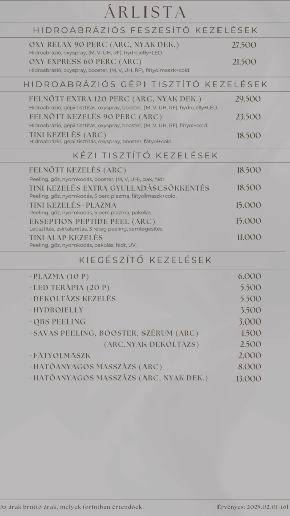 • A kezelés napján történt lemondás esetén, vagy ha nem jelentek meg a megbeszélt időpontban, rendelkezésre állási díj fizetendő, ami az áthelyezett szolgáltatás árának 50%-a melyet a következő látogatás során számolunk fel.